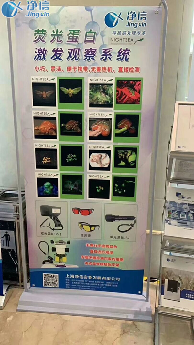 同時,在此次展會上,上海凈信還推出了一款沉淀已久的新產(chǎn)品—美國NightSea熒光蛋白激發(fā)觀察系統(tǒng),這是一款無需化學(xué)底物顯色,直接進(jìn)行觀測,不損壞被檢測對象細(xì)胞的設(shè)備,擁有小巧、靈活、易攜帶、使用簡便等優(yōu)點,對于有轉(zhuǎn)基因?qū)嶒炐枨蟮目蒲腥藛T,是一種特別“對胃口”的產(chǎn)品;其原理是發(fā)出的特種光源照射至生物表面時,佩戴專用濾光鏡(過濾掉大部分反射光只保留所需要的光源);便可實時觀察生物的基因變化狀態(tài),目前分為單光源和雙光源兩種型號。